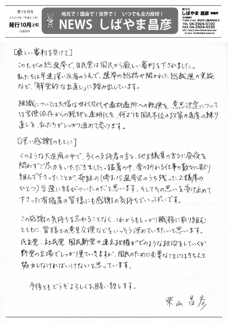 NEWSしばやま昌彦09.9月号(表面) | | |